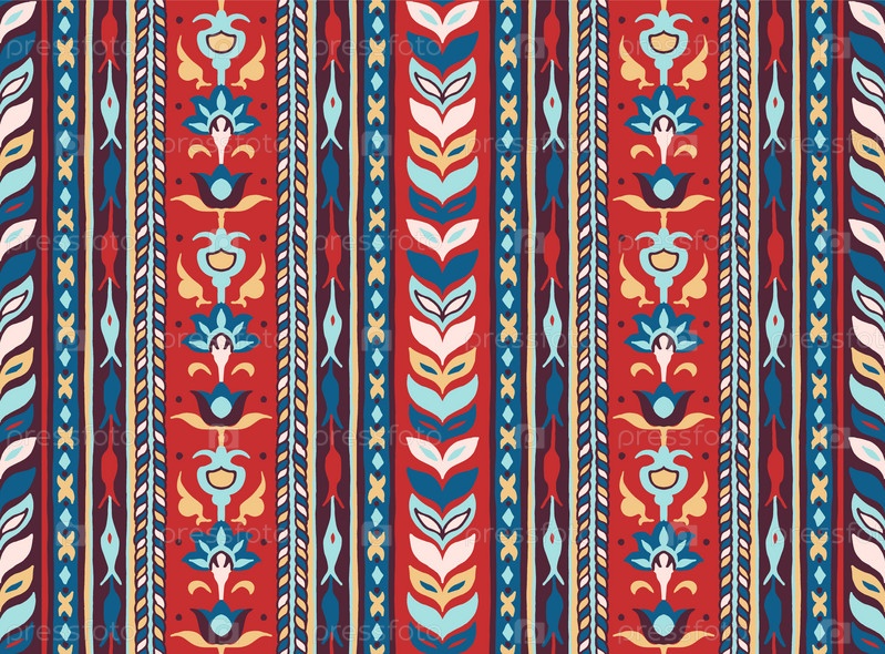 Геометрический дамасский орнамент. Икат границы. Этническая вышивка с листьями и монограммами. Племенная векторная текстура. Бесшовный народный узор в ацтекском стиле. Индийский, скандинавский, цыганский, мексиканский, африканский ковер
