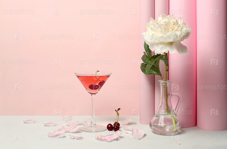Современный натюрморт с розовым мартини, летним алкогольным коктейлем для вечеринки и цветами пиона на элегантном современном фоне, минимальная концепция бара, кафе, рекламный баннер, избирательный фокус,