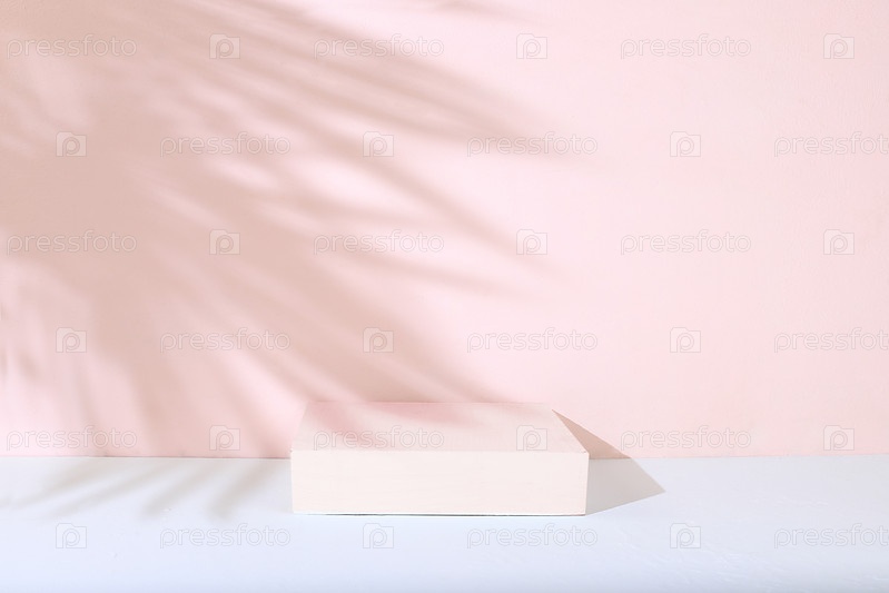 Абстрактный фон с натуральными деревянными подиумами и длинными тенями на розовой стене, пустая витрина для демонстрации или презентации косметических продуктов, минимальная экологическая концепция, избирательный фокус