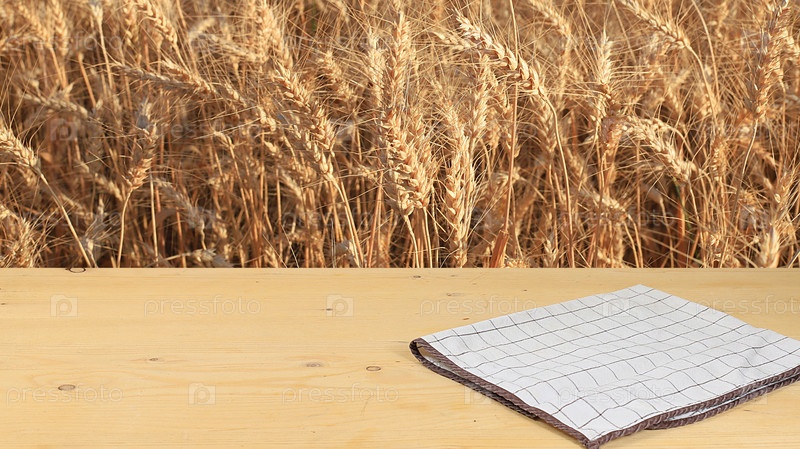 Пустой деревянный деревенский стол на фоне пшеничного поля, концепция сбора урожая. Еврейский праздник Шавуот, макет для демонстрации дизайна и продукта, выборочный фокус
