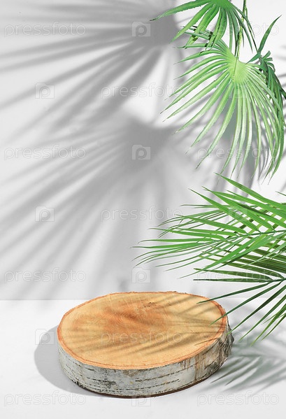 Пустая витрина с деревянным подиумом для демонстрации или презентации косметических продуктов, сцена для дизайна, абстрактный фон с пальмовыми листьями и длинными тенями, современный креативный дисплей, выборочный фокус