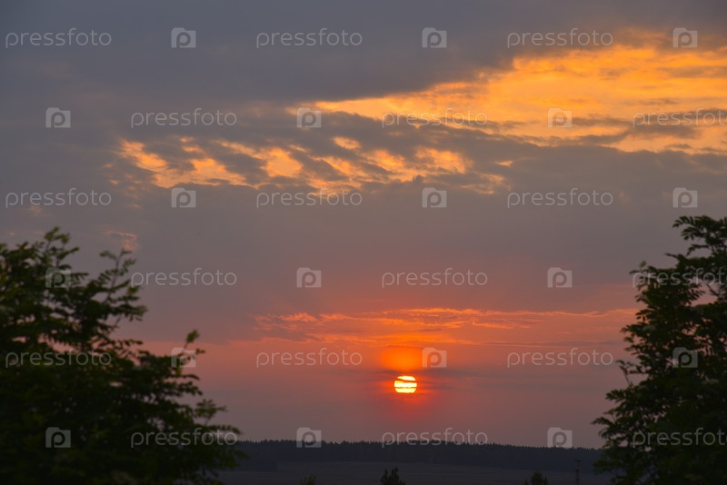 Вечерние деревья заката в саду. Заходящее солнце и горизонт