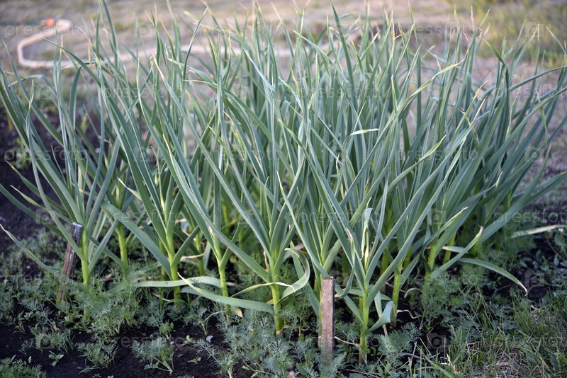 Зеленая грядка с чесноком в саду. Красиво растущий чеснок