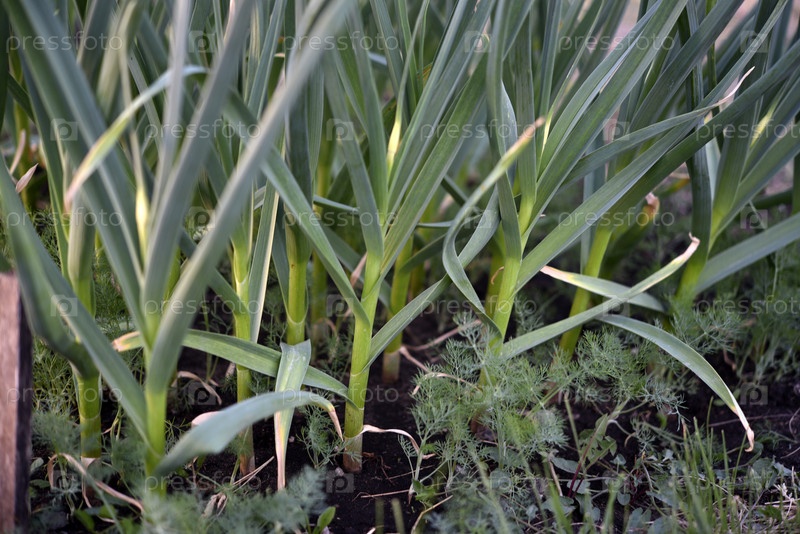 Зеленая грядка с чесноком в саду. Красиво растущий чеснок