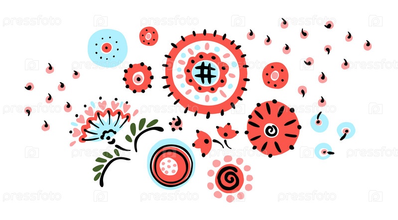 Набор этнических элементов. Бордюр представляет собой полосу с цветами, листьями, ветками, вензелями. Народная вышивка. Славянский, украинский, русский мотив. Хохлома, матрешка, дымковская игрушка. Мексиканский, индийский, цыганский ковер. Вязаное кружево