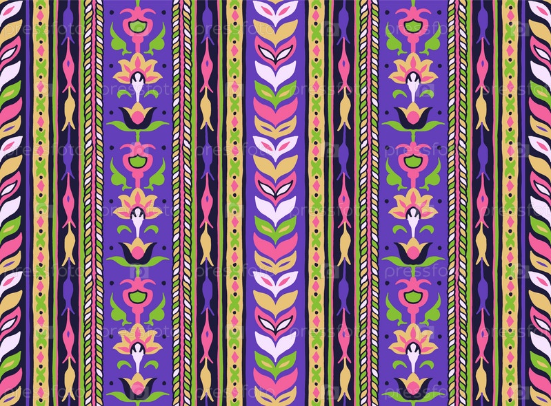 Геометрический дамасский орнамент. Икат границы. Этническая вышивка с листьями и монограммами. Племенная векторная текстура. Бесшовный народный узор в ацтекском стиле. Индийский, скандинавский, цыганский, мексиканский, африканский ковер