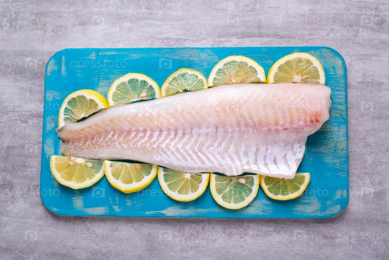 Сырое филе трески на деревянной доске бирюзового цвета с ломтиками лимона. Ингредиент из свежих морепродуктов. Приготовление белой рыбы. Вид сверху