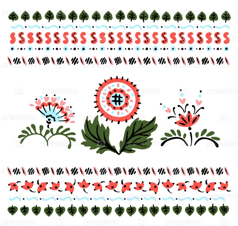 Набор этнических элементов. Бордюр представляет собой полосу с цветами, листьями, ветками, вензелями. Народная вышивка. Славянский, украинский, русский мотив. Хохлома, матрешка, дымковская игрушка. Мексиканский, индийский, цыганский ковер. Вязаное кружево