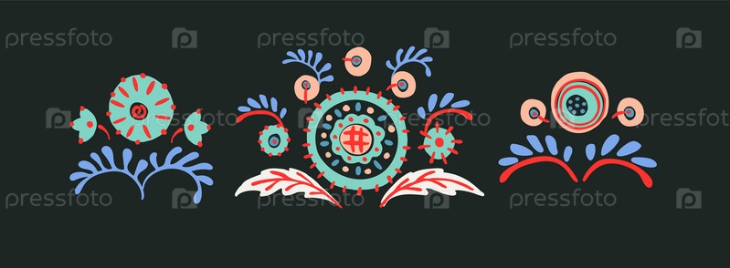 Набор этнических элементов. Бордюр представляет собой полосу с цветами, листьями, ветками, вензелями. Народная вышивка. Славянский, украинский, русский мотив. Хохлома, матрешка, дымковская игрушка. Мексиканский, индийский, цыганский ковер. Вязаное кружево