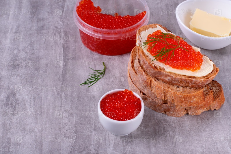 Бутерброд с красной икрой и маслом на сером столе