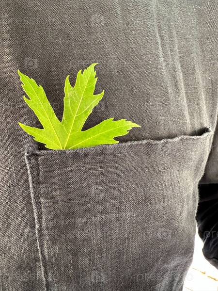 Зеленый кленовый лист лежит в кармане одежды