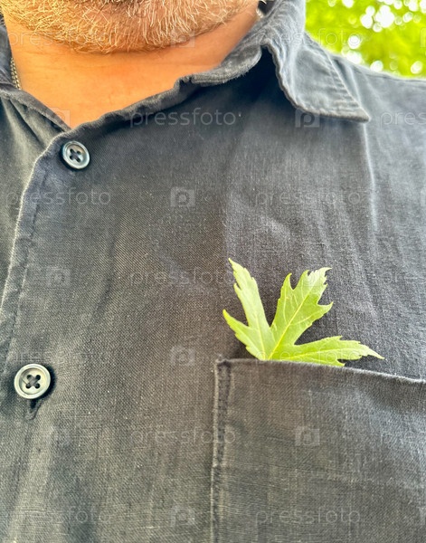 Зеленый кленовый лист лежит в кармане одежды