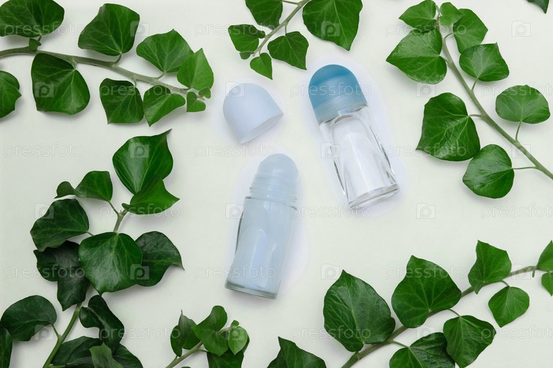 Роликовые дезодоранты с зелеными листьями и ветвями плюща на белом фоне, вид сверху, концепция личной гигиены, ухода за собой и дерматологии