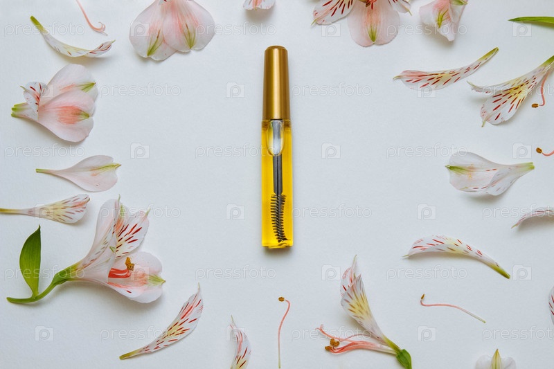 Косметическое масло для ресниц и бровей в прозрачной пластиковой бутылке на белом фоне с рамкой из цветов и лепестков альстромерии, концепция красоты, ухода и лечения, копия космического продукта