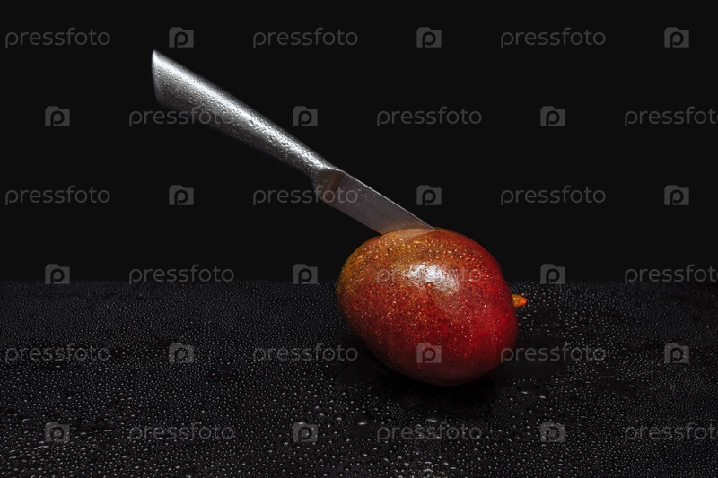 Плоды красного манго на черном фоне крупным планом на столе с каплями воды и режущим ножом с пустым пространством для текста, копией пространства, концепция приготовления экзотических и тропических десертов и напитков