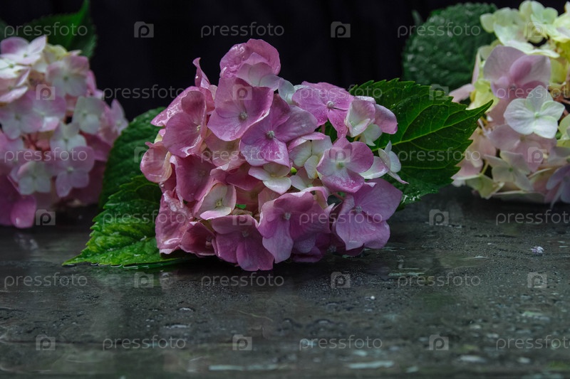 Розовые цветы гортензии с зелеными листьями на стеклянном столе с каплями воды и отражением на черном фоне, концепция поздравительной открытки, дизайн обложки, оформление