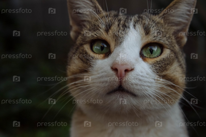 Портрет любопытного кота с зелеными глазами крупным планом на размытом фоне с зелеными растениями, концепцией домашних животных, уходом, кормлением и лечением