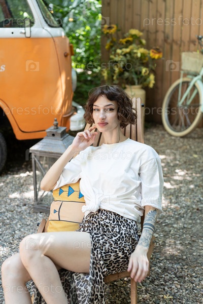 Молодая красивая женщина сидит в кресле на открытом воздухе летом