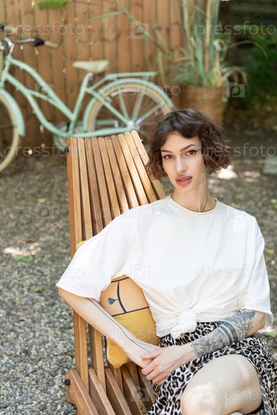 Молодая красивая женщина сидит в кресле на открытом воздухе летом