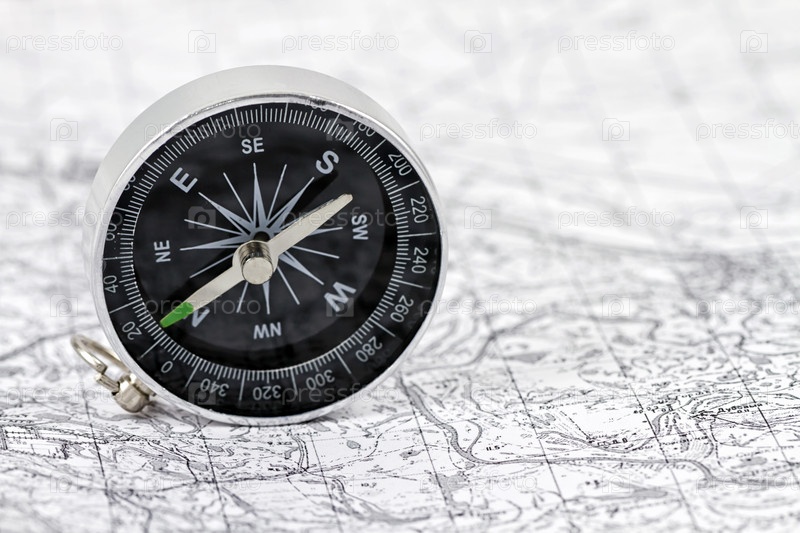 Компас лежит на черно-белой карте