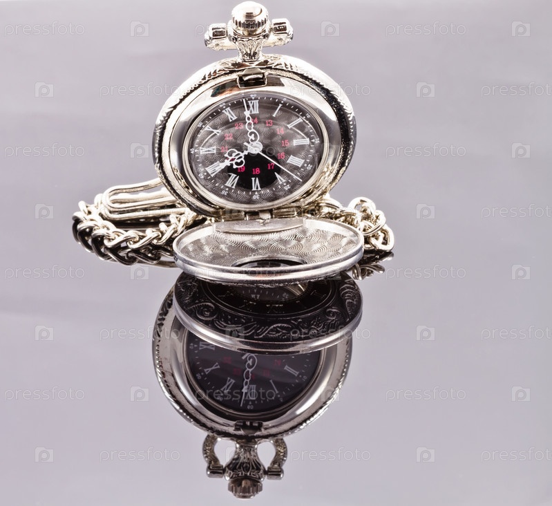 Серебряные карманные часы на отражающей поверхности