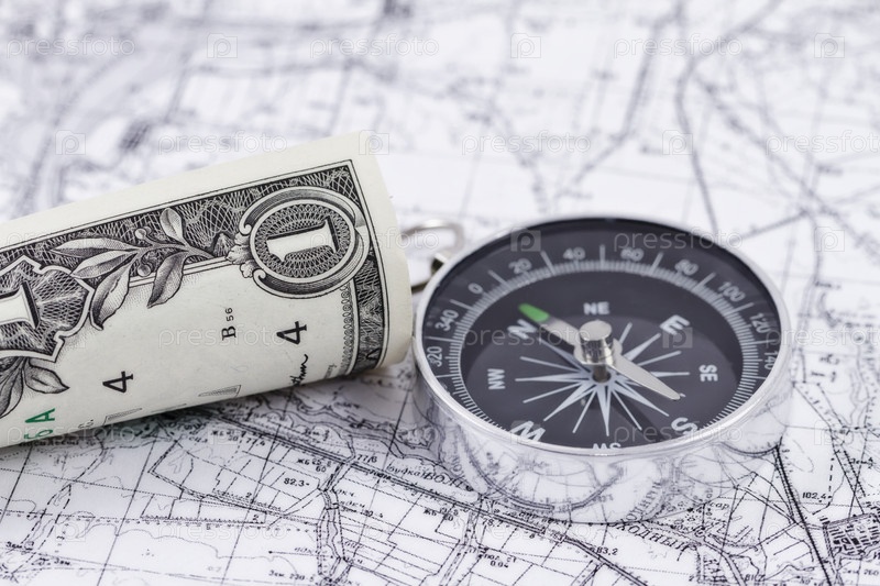 Однодолларовая купюра и компас, лежащие на карте