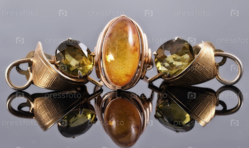 Серьги из старинного золота с зелеными камнями и кольцо с янтарем