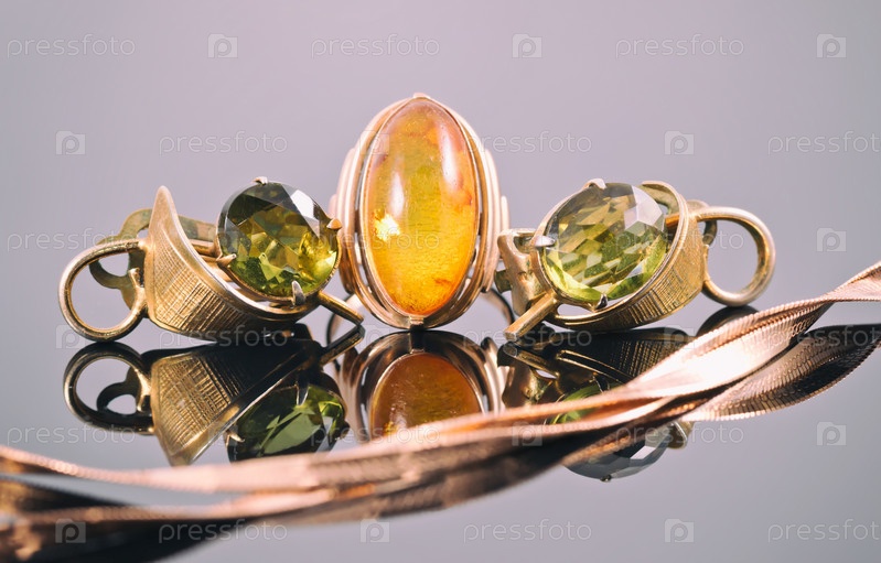 Серьги из старинного золота с зелеными камнями и кольцо с янтарем
