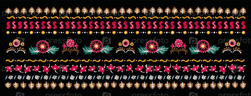 Набор этнических элементов. Бордюр представляет собой полосу с цветами, листьями, ветками, вензелями. Народная вышивка. Славянский, украинский, русский мотив. Хохлома, матрешка, дымковская игрушка. Мексиканский, индийский, цыганский ковер. Вязаное кружево