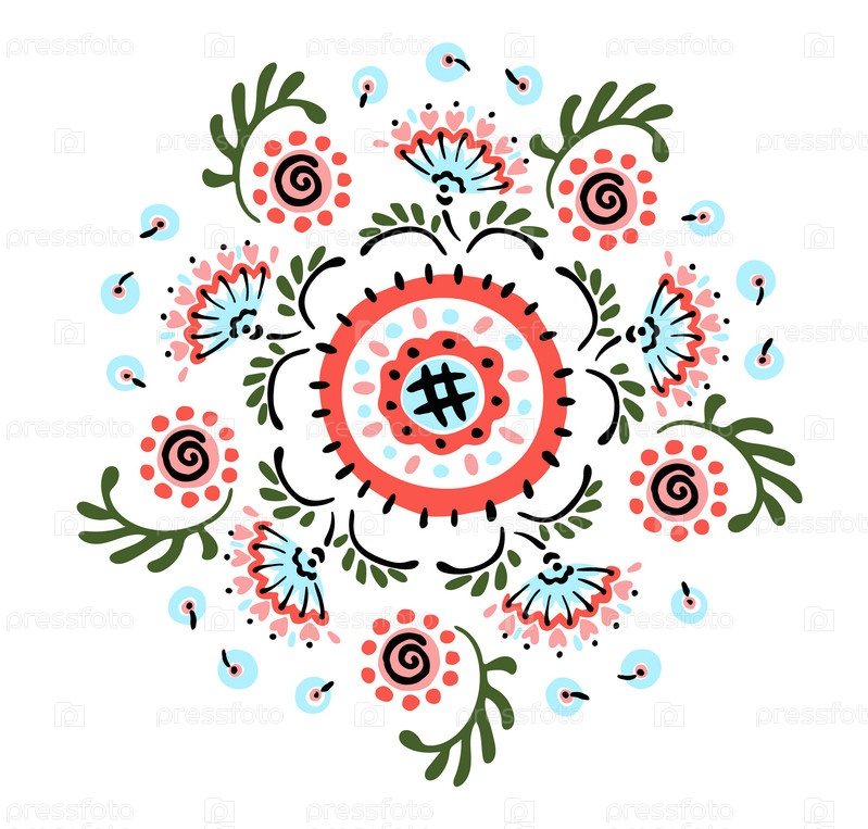 Набор этнических элементов. Бордюр представляет собой полосу с цветами, листьями, ветками, вензелями. Народная вышивка. Славянский, украинский, русский мотив. Хохлома, матрешка, дымковская игрушка. Мексиканский, индийский, цыганский ковер. Вязаное кружево