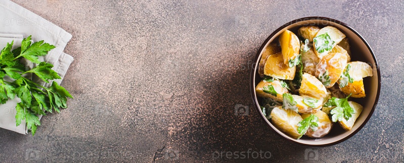 Вкусный картофельный салат с петрушкой и майонезом в тарелке на столе, вид на веб-баннер