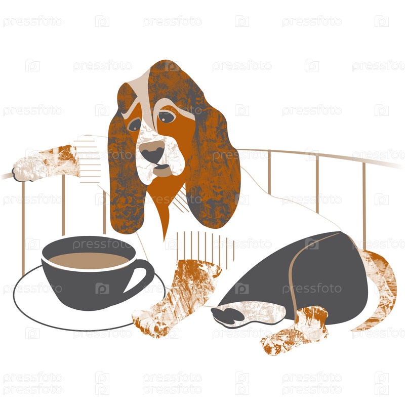 Графическое изображение собаки породы бассет хаунд, которая лежит рядом с чашкой на белом фоне