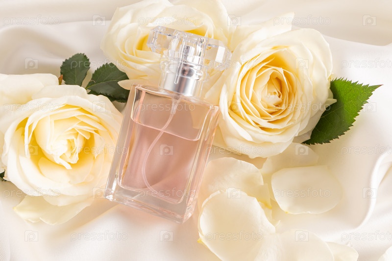 Прозрачный флакон с элегантным цветочным ароматом опирался на шикарные белые чайные розы. Презентация аромата. Безымянная бутылка для брендинга