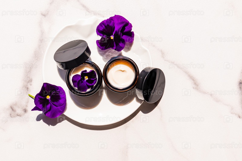 Две открытые баночки с дневным и ночным кремом для интенсивного ухода за зрелой кожей лица и шеи. Вид сверху. мраморный фон. фиолетовые фиалки