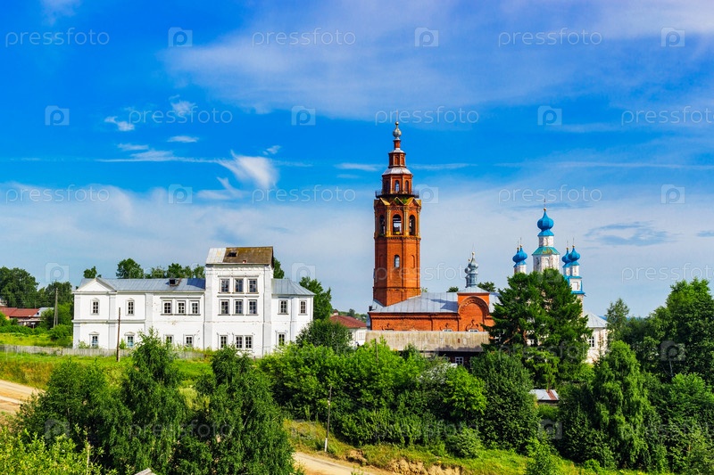 Вид на церкви в маленьком русском городке в летний день