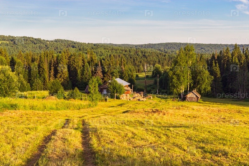 Деревянный дом на поляне у леса