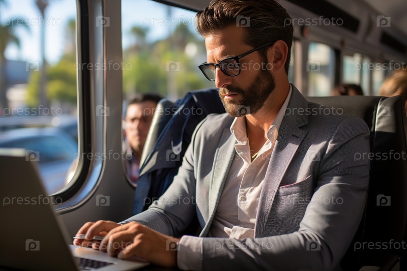 Бизнесмен работает в транспорте на ноутбуке. Генеративный ИИ