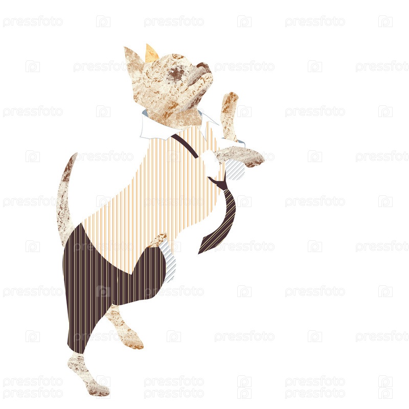 Графическое изображение собаки породы чихуахуа, стоит на задних лапах в полосатой рубашке, галстуке и черных брюках на белом фоне
