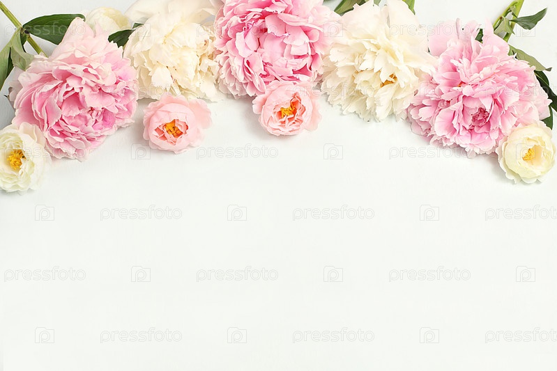 Красивые цветы пиона и розы на светлом фоне, цветочная композиция с местом для текста, летний баннер, поздравительная открытка на свадьбу, день рождения, шаблон для дизайна,