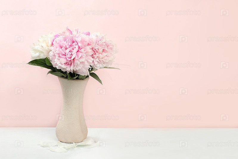 Цветочная композиция с цветами пиона в вазе на светлом фоне, летний баннер, поздравительная открытка на свадьбу, праздник, день рождения, шаблон для дизайна,