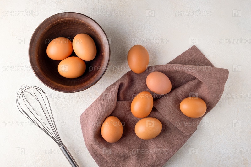 Куриные яйца в миске на столе с венчиком, чтобы взбить яйца