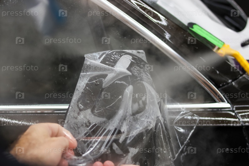 Процесс установки ППФ на боковое зеркало. PPF это защитная пленка для краски, которая предохраняет краску от царапин и гравия. Защита от гравитации. Установлена ПФФ. Окружение автомобиля в крупном плане