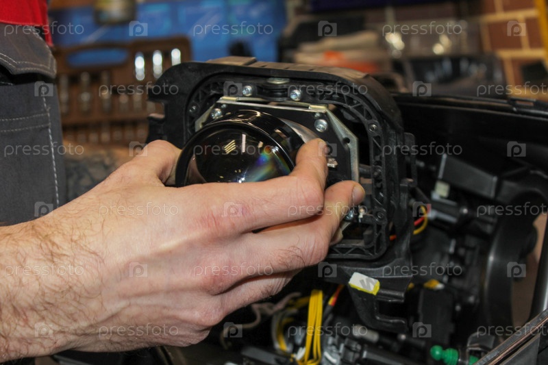 Автомобильная фара в ремонте крупным планом. Автомеханик устанавливает линзу в корпус фары. Концепция автосервиса. Установка светодиодных линз в фару. светодиодная линза
