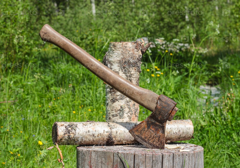 Топор с деревянной ручкой воткнут в ствол дерева в ясный солнечный день крупным планом. Топор с близкого расстояния на фоне размытых деревьев. Заготовка дров