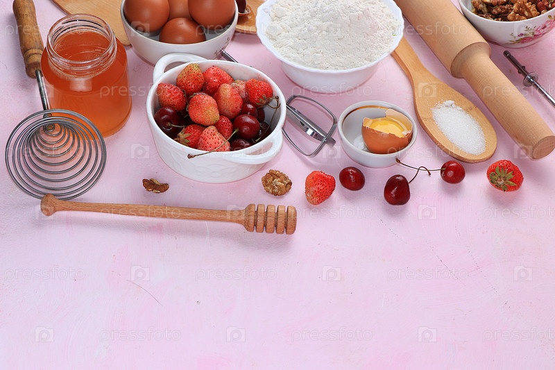 Рецепт приготовления клубнично-вишневого пирога. Яйца, мука, сазар, клубника и мед, вид сверху, плоская планировка. Фон хлебобулочных изделий,