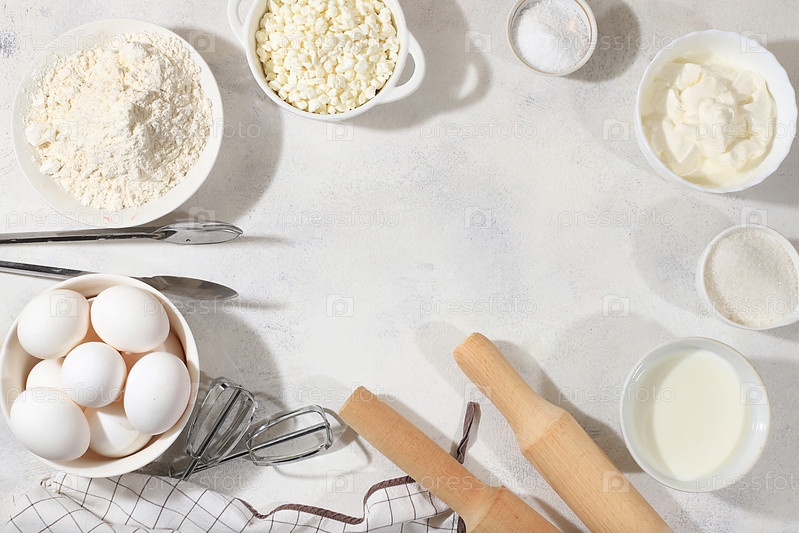 Рамка для выпечки и приготовления торта, хлеба, кондитерских изделий и ингредиентов для приготовления пищи, молока, муки, соли, сахара, яиц и сливок на бетонном фоне с местом для текста, выборочным фокусом, видом сверху