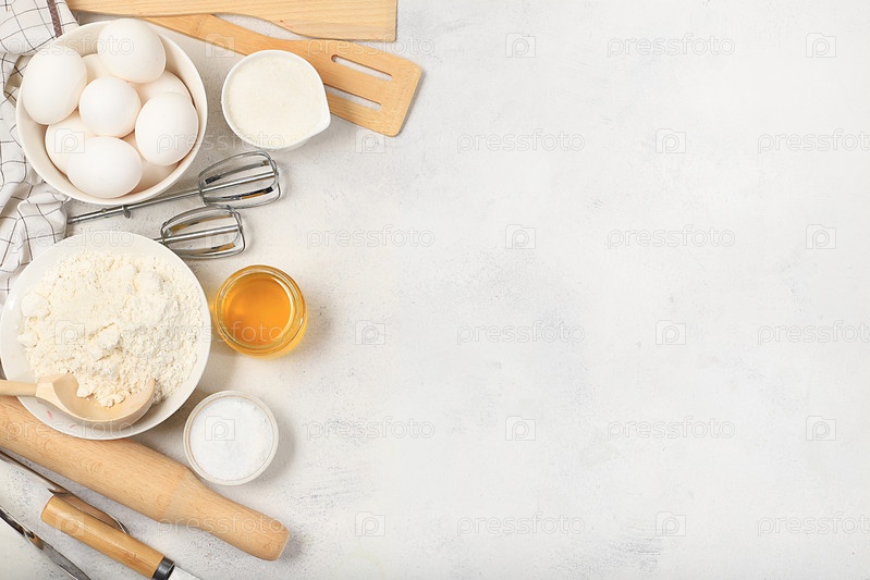 Кухонный фон для выпечки и приготовления торта, хлеба, кондитерских изделий и ингредиентов для приготовления пищи, молока, меда, муки, соли, сахара, яиц и сливок на бетонном фоне с местом для текста, выборочный фокус, вид сверху