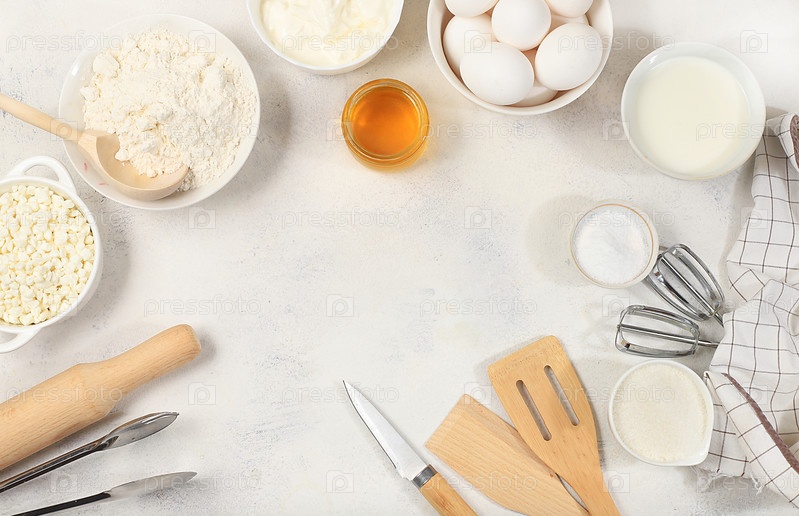 Кухонный фон для выпечки и приготовления торта, хлеба, кондитерских изделий и ингредиентов для приготовления пищи, молока, меда, муки, соли, сахара, яиц и сливок на бетонном фоне с местом для текста,