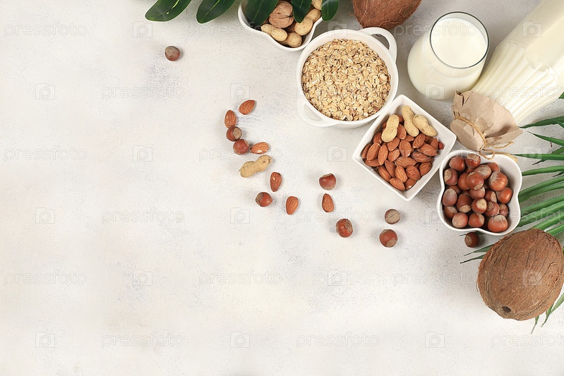 Ассорти из веганского безлактозного молока, кокоса, орехов, овса, миндаля, заменителя молока, здорового завтрака с ингредиентами, концепции натурального питания, поддержания здоровой микрофлоры кишечника, диетического питания, деревенского стола, селектив
