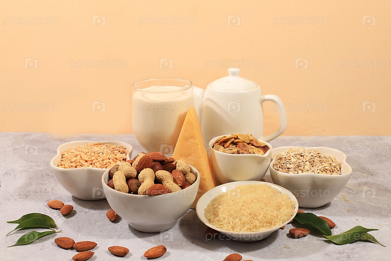 Ассортимент веганских немолочных продуктов на бетонном столе, баннер магазина, растительные альтернативные молочные продукты - молоко, сливки, йогурт, сыр, орехи, рис, овсянка, чечевица, концепция здоровой натуральной пищи, вид сверху, выборочный фокус